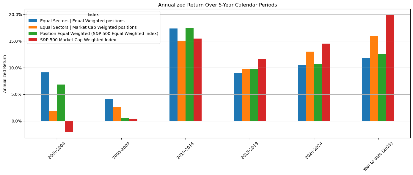 For this analysis, we compared multiple weighting methodologies for the S&P 500—market-cap weighted, position-equal weighted, sector-equal weighted, and sector & position equal weighted—to evaluate how portfolio structure influences long-term performance. The market-cap and equal-weighted benchmarks are sourced directly from official S&P Global data, while the sector-equal-weighted composites were reconstructed internally using the same annual rebalancing schedule applied at the start of each calendar year.