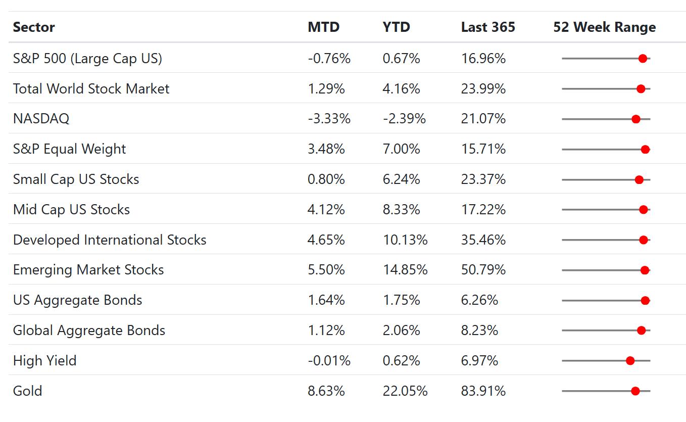 February’s market looked mixed on the surface, but it was highly active underneath. Large‑cap benchmarks were held back by weakness in a narrow slice of mega‑cap growth and AI‑adjacent software, while equal‑weight and mid‑cap/value exposures posted their strongest relative results in months. Many investors experienced a “two markets” dynamic: the well‑known index leaders cooled, while a broad set of sectors quietly strengthened. The S&P 500 Equal Weight Index surged 3.5%. Small- and mid-caps also outperformed (2.7%), suggesting that market participation is broadening as investors look beyond the narrow leadership of the "Magnificent Seven."
